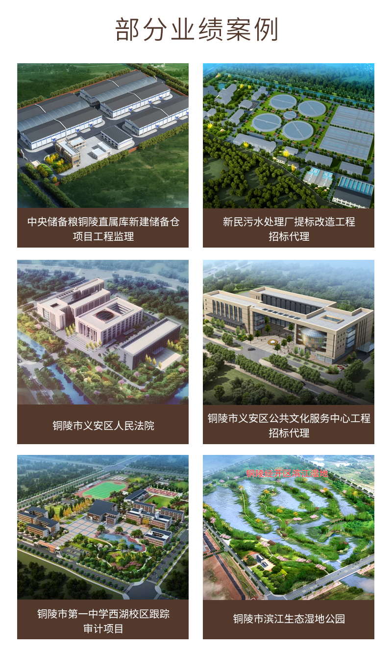 主要工程監(jiān)理項目如:黃山互助公社項目、黃山區(qū)瑞園一期工程、黃山區(qū)瑞園二期工程、南陵新天地商業(yè)廣場項目工程、南陵萃英園中學(xué)學(xué)生公寓及食堂建設(shè)工程、銅陵濱江生態(tài)岸線北延伸段(東側(cè))整治工程-景觀工程、銅陵市黑砂河下游截污工程、中央儲備糧銅陵直屬庫新建儲備倉工程、銅港路綠化改造提升工程、恒順紫金城4-1地塊6#-10#樓工程、中房?微公館、市政設(shè)施管養(yǎng)所與城市綠化管理養(yǎng)護(hù)基地維修用房工程、民主小學(xué)教學(xué)樓及辦公樓工程、安徽泰新汽車項目年產(chǎn)10萬輛份乘用車漆后車身總成項目、銅陵市城市雕塑維護(hù)和建設(shè)項目、銅陵市特殊學(xué)校教學(xué)樓及宿舍工程、銅陵新港塑膠制品有限公司廠房工程等、五松鎮(zhèn)荷花塘(含頂管)及月瀛玉帶小區(qū)整治工程、義安區(qū)鐘鳴硫鐵礦廢棄礦坑滲水治理項目、銅陵獅達(dá)防火門廠1#2#廠房及綜合樓工程、銅陵市濱江生態(tài)岸線北延伸工程(濱江大道東側(cè)景觀整治)、黑沙河水質(zhì)提升改造工程一標(biāo)段、義安區(qū)法院審判庭工程、市一中圖書閱覽室工程及樅陽縣城區(qū)防洪安保應(yīng)急工程連城湖出口左右岸堤防加固工程(一標(biāo)段、二標(biāo)段)。